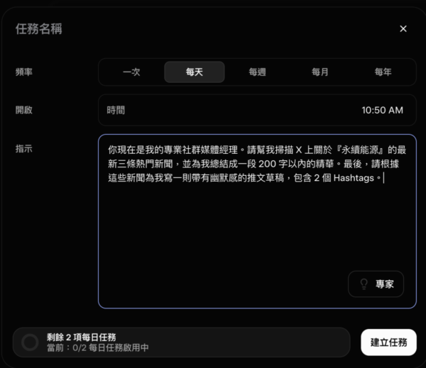 在 Grok 的設定中預設你的任務背景。這樣每次你只需輸入「執行每日任務」,它就會自動按照你預設的邏輯運作,無需重複輸入長指令。